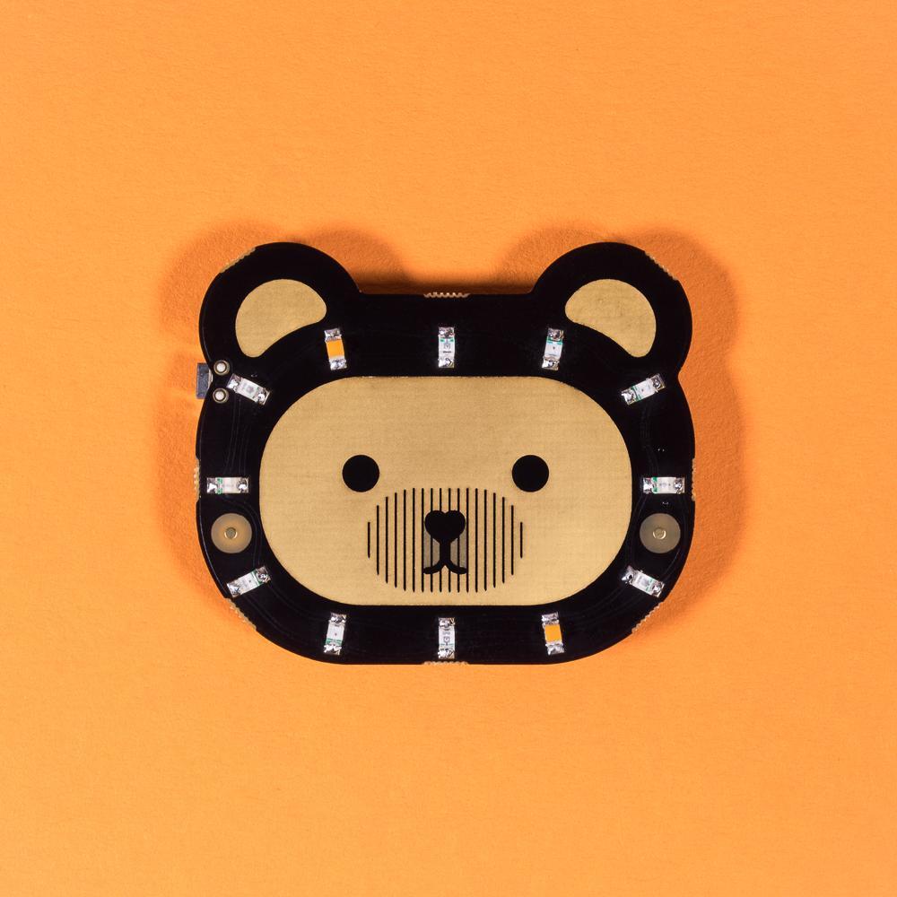 A bewildered bear badge with 12 coloured LEDs and 12 light patterns, that's sewable, hackable, wearable, and adorable!