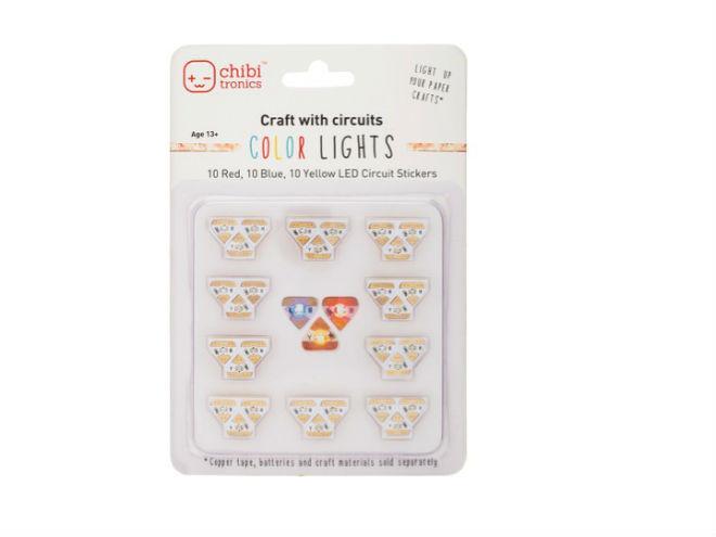Color your world with Chibitronics MegaPack of 30 circuit stickers - 10 red, 10 yellow, and 10 blue.